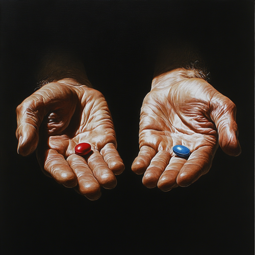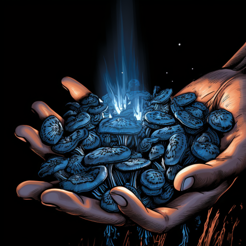 Extreme close up of blue mushroom bits in the palm of a hand, lit by the light of the moon, camp fire, graphic novel style