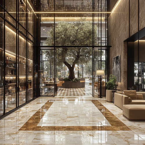 you are entering in a furniture showroom through the all glass entry, after you pass the glass doors you see an 1200 m2 space, left sofas and dining tables, right a bar at the beginning, a reception and door exposition further. Imagine in the middle a big olive tree in marble layout and underneath a big artistic mosaic which shows artistic and glamour values. This mosaic is only in the midde of the showroom, the rest is antracid tiles.
