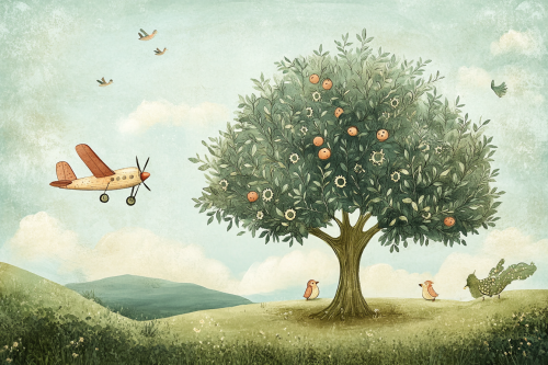 A whimsical children's book illustration showing an olive tree . Parked next to the tree are a small airplane, a bird-shaped glider, and a blimp with detailed gears and propellers. Soft, playful tones, hand-painted pastel colors, minimalistic and vibrant --ar 3:2 --v 6.1