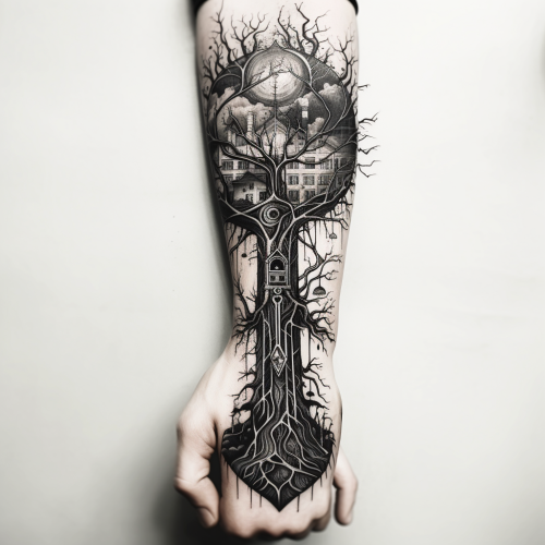 create a tattoo illustration against a white background in black-work style in the typical dimensions of a human arm. The tattoo should depict an abstract tree-of-life, deep roots and catholic church inspired interior architecture intertwined with the branches and leaves. Abstract Sketch style lines, shadows, abstract geometric shapes, shading and ink blots.