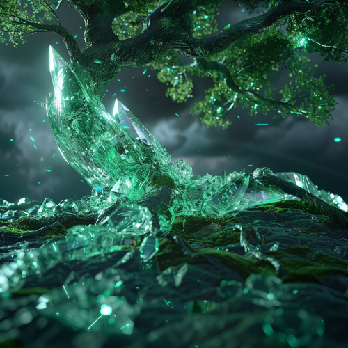 Chien réaliste avec des pouvoirs de terre, son pelage est d'un brun terreux avec des motifs de racines et de mousse. Ses yeux sont d'un vert profond, et des racines et des pierres flottent autour de ses pattes. Le fond montre un paysage forestier luxuriant avec des arbres, des rochers, et des végétations. 8K, highly detailed, --ar 9:16