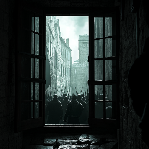 view through an open window into a dark alley of a medieval city. Dark shadows, eerie atmosphere. In the background there is a group of armed and armoured knights, hardly visible in the darkness. Only silhouettes. No faces can be seen. These knights are targets for the spectator in the room