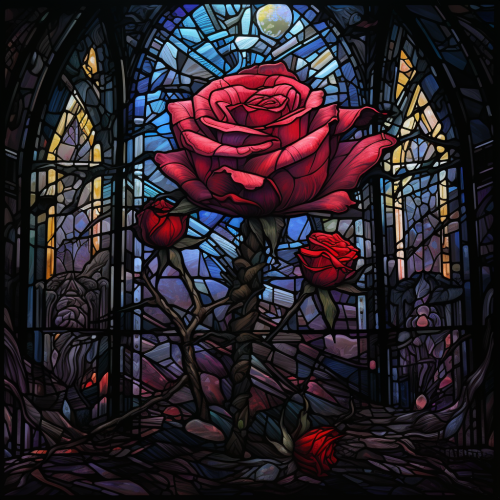 a black rose in a room with stained glass windows, in the style of ethereal, ghostly figures, intricate use of hatching, , haunting structures, theatrical gestures, catherdals, dark, horror, evil