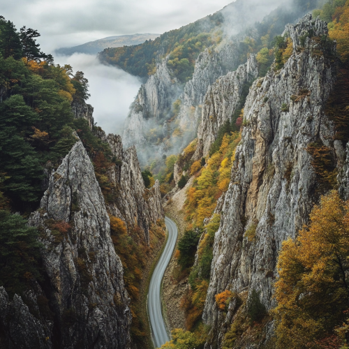 close-up of a winding mountain road that cuts through steep rocky cliffs in the Transylvanian mountains. The road should dominate the foreground, with sharp turns and dramatic angles, while dense forests and rugged cliffs rise around it. Capture a sense of depth with the road disappearing into the distance, framed by misty clouds and towering peaks. The overall scene should evoke a powerful, adventurous journey through nature, with an intimate perspective on the road itself. --v 6.1