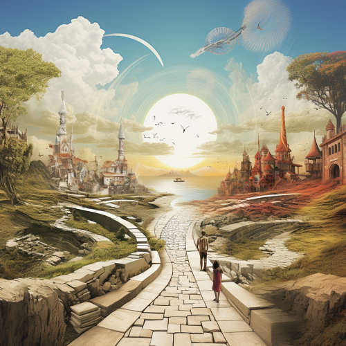 a painting of a book and a picture of a space station in the sky with a sun and clouds --ar 2:3 --v 5.2