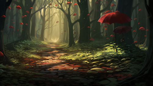 day wore on and the shadows grew longer, winding trail deeper into the woods, the lush canopy of trees forming a magical umbrella above them, children book illustration style, Pixar style --ar 16:9