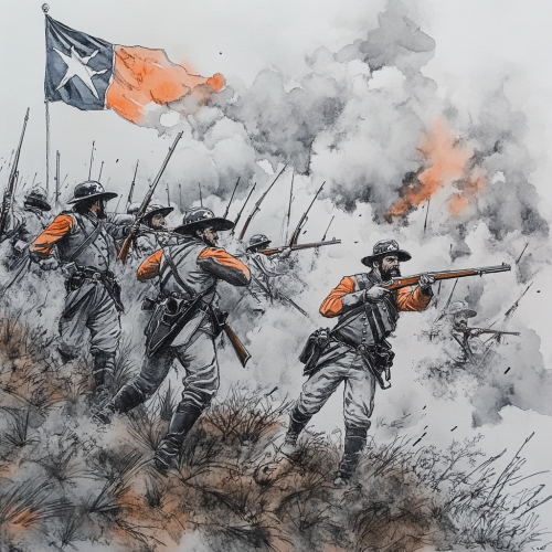 pen and ink drawing colored in with watercolor of a brigade of confederate style soldier wearing gray and orange uniforms charging across a smoky battlefield