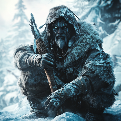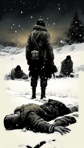 Exhausted soldiers in snow-covered battlefield with frozen weapons.