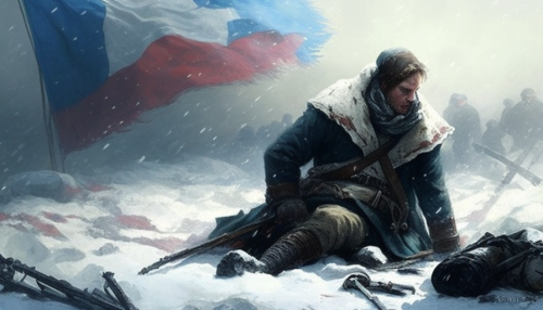 1812 years. A somber, snow-covered battlefield with exhausted french soldiers in tattered clothing, struggling through deep snow. Some lie down, others crawl or stumble, with frozen weapons and a harsh winter dominating the scene. The atmosphere conveys overwhelming despair and the aftermath of a failed military campaign. --ar 16:9 --v 4