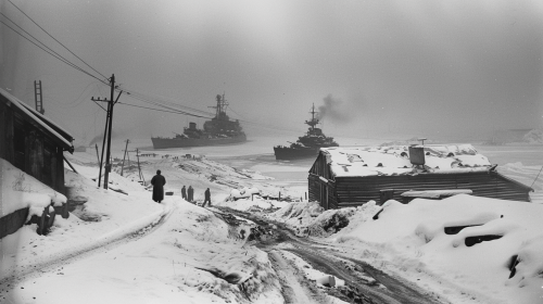 Cold winter scene near Vladivostok, Russia on February 22, 1953, amidst the final days of Stalin’s rule. The foreground shows snow-covered military outposts with soldiers patrolling the perimeter, reflecting the region’s strategic importance. In the background, the icy Sea of Japan glistens under a cold, overcast sky, with naval ships visible in the distance. The lighting is dim and chilly, capturing the tense atmosphere of this militarized and remote area. --ar 16:9 --v 6.0 --style raw