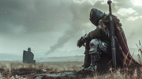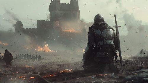 Medieval soldiers who lost the war and are exhausted and very sad to have lost friends. The front soldier does not have weapons and is kneeling, he looks towards a burning castle. Clear sky with white light --ar 16:9 --v 6.0