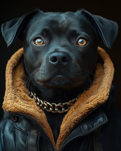 Ultra-realistic portrait, a black mixed breed dog, the dog is dressed in a hip hop, rap or urban music singer style, he wears chains of accessories on his neck photo shoot, portrait photography, high definition, detailed, 8k, high quality , great detail, photographic, photogenic, perfect, inside a room with faded background elements in dark colors --v 6.1 --ar 4:5 --s 1000