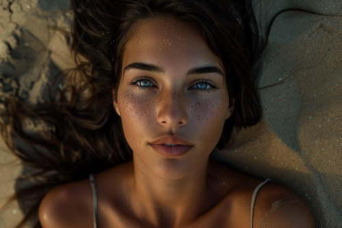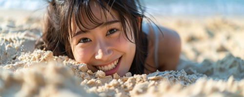 Woman playing in the sand.Japanese teen mode.Smile. Full color photo.The resolution should be 30.4 megapixels, ISO sensitivity: 100, Shutter speed 1/2000 second. The image should be hyper-realistic, highly detailed, and high-resolution 16k. photogenic, --style raw --aspect 5:2 --v 6.0