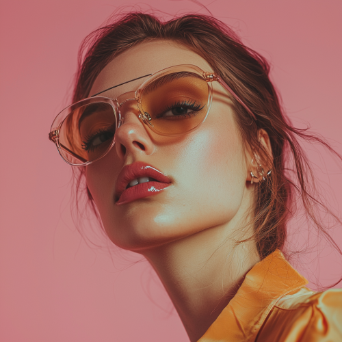 portrait of a nerdy female model with oversized sunglasses wes anderson influence, sony a7rV, 85mm 1.8 lens, photo realitistic, solid color background --q 2