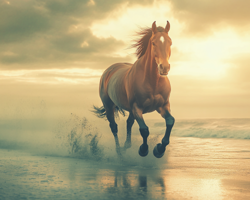 Full body portrait photo of a beautiful brown horse running frisky by the beach , classic vintage style , 1960s, photo taken at dawn , sunlight is almost blinding, editorial photography, emotional art, shapes are fluid and undefined, high definition digital art, negative color, a mix of pastel colors and neon, a poetic and creative perspective, inspired by Man Ray's visionary photography, large-screen camera, photo art that is also inspired by digital art, cold color scale with hints of flickering neon, --ar 5:4 --p 6s1y8tz