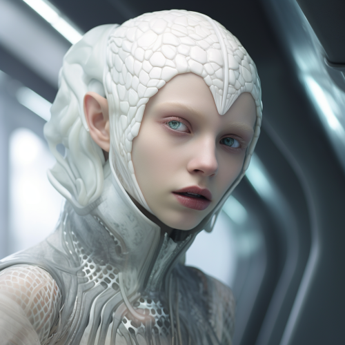 as image of alien (an alien young woman, white hair, experimental, mutantcore, with scales, albino skin atractive, very detailed, soft, delicate, color photo) in a starship