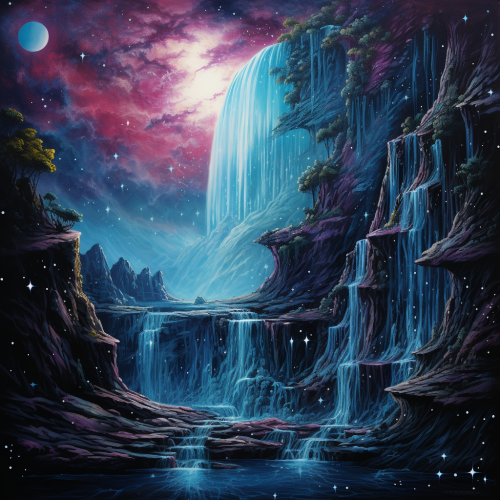 Craft an enchanting illustration where the celestial elements take center stage--a vast sky adorned with myriad stars and a colossal, luminous moon dominating the canvas. Utilize graceful, swirling lines to depict the celestial dance of stars and the moon's radiant presence, filling most of the illustration. Illustrate the moon as a captivating focal point, radiating its soft, ethereal glow across the expanse. Let the stars twirl and spiral in whimsical patterns around the moon, creating a celestial symphony against the night sky. Beneath this cosmic display, portray a lush jungle embraced by the moonlight's gentle touch. Employ intricate yet fluid lines to outline the foliage and trees, capturing the dreamlike quality of the nighttime scenery. Utilize a captivating illustration style that merges the cosmic beauty of the sky with the enchanting details of the jungle below, blending the fluidity of the celestial lines with the intricacies of the jungle's foliage. --ar 16:9 --v 6.0