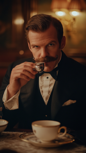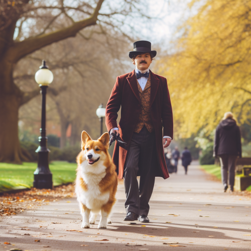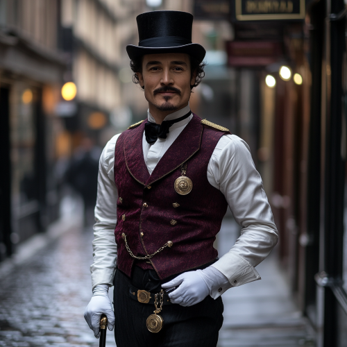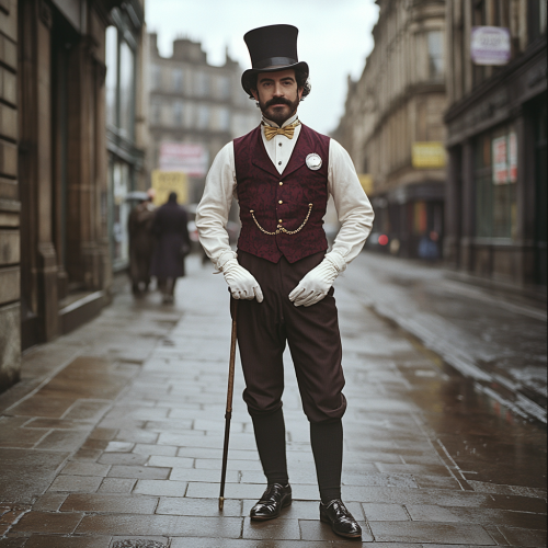 A well off man standing on the corner on a city street in Glasglow Scottland with a black cane, a tall black top hat, a maroon silk vest with gold buttons, a pocket watch hanging in his pocket with a chain, white gloves, white shirt with white cuffs and gold cuff pins, handle bar mustache with a goatee, dark facial hair and dark curly hair under his hat, he is happy, in the 1950’s, the sidewalk is wooden and his shoes are hard enough to clank when he walks, there are signs hanging in front of the buildings, it is raining --style raw