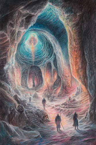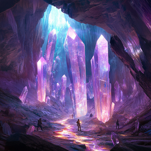A dazzling underground cavern filled with giant crystals reflecting light in all directions, a river of glowing liquid flowing through, and explorers marveling at the natural wonder, 1:1 --v 6.1