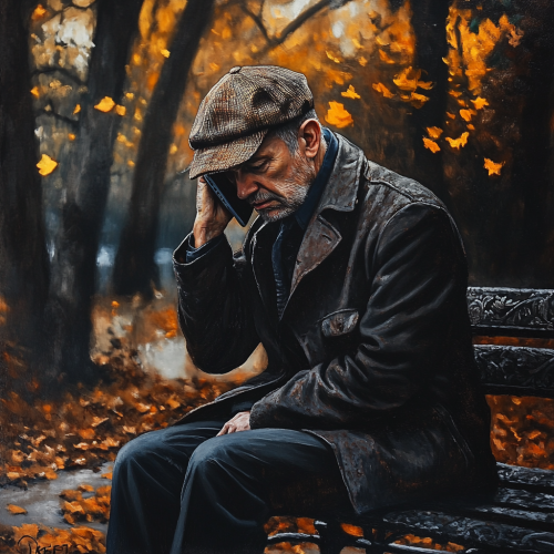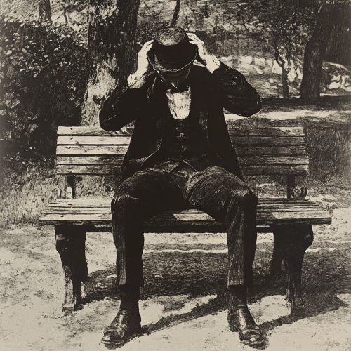 A young distinguished gentleman with a hat is waiting on a bench in a park, he looks desperate by waiting someone who will never come at his rendez-vous, desperate, he his holding his head with his hands in despair