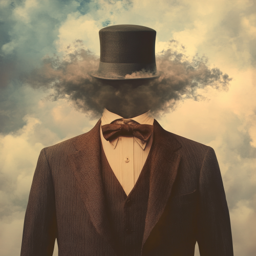 Me gustarÃa obtener una imagen surrealista de un hombre de los años 20 en Inglaterra vestido de forma muy elegante. Es una imagen de retrato, apenas se le ve un pañuelo en el cuello como parte de su atuendo. Su cabeza aparece abierta en la parte superior y de ella salen objetos futuristas hacia el cielo.