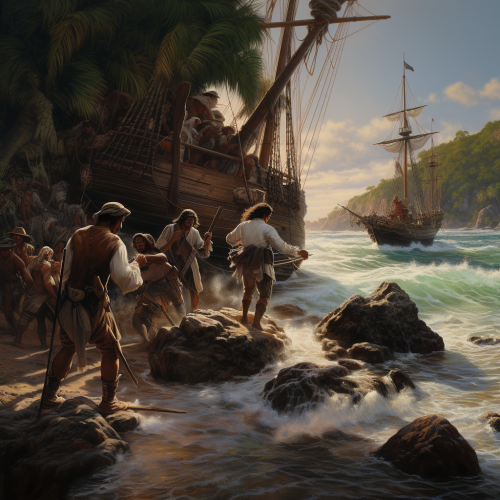 Exhausted yet determined explorers, their clothing torn by the relentless embrace of the jungle thicket, navigate a labyrinth of towering trees and tangled vines, ever watchful for hidden dangers that lurk in the shadows of the Amazon, 8k, high def,