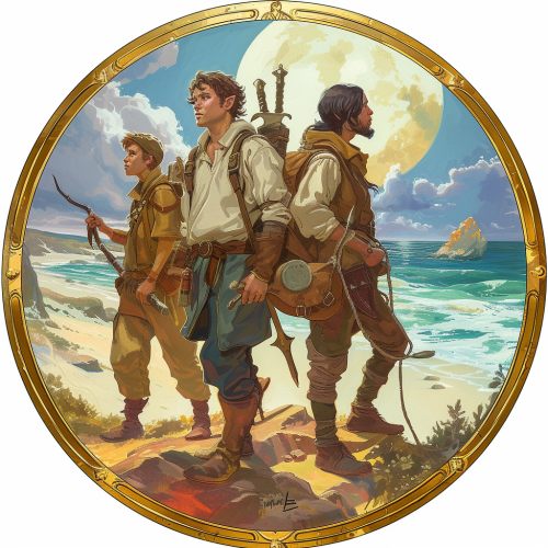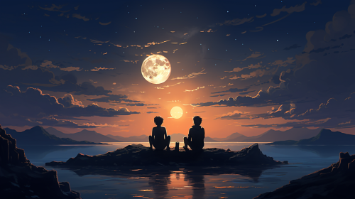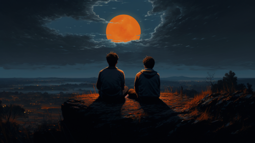 3 friends sitting far away looking at the moon, journey, evening, dark blue and reddit orange color --ar 16:9