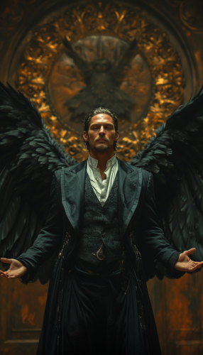 full body 30 years-old luxurious gentleman with his arms out, wear a Bond Suit Vest Black, elegant, masculine, The eagle spread its wings and perching on shoulder of men, dark background, realistic, high resolution, size 3000 pixel, 300 dpi --chaos 10 --ar 4:7 --s 1000 --v 6.0 --style raw