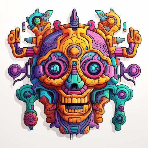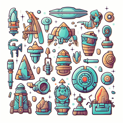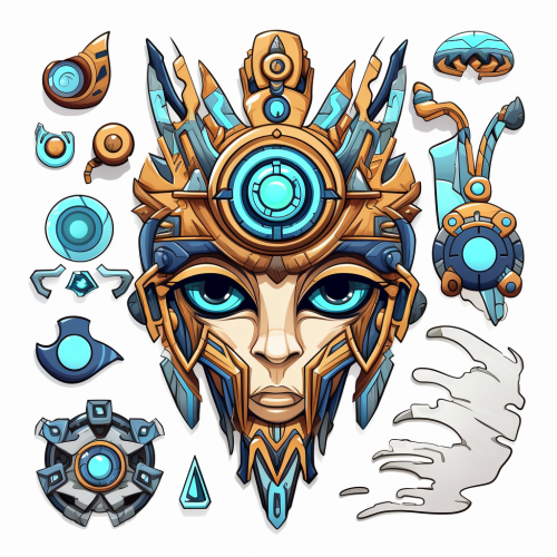 imagineFuturistic ancient artifacts, crazy cool looking, Sticker, Cheerful, Vibrant Color, Artstation, Contour, Vector, White Background, Detailed