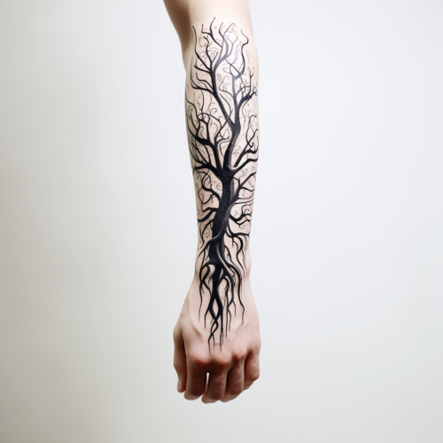 create a tattoo illustration against a white background in black-work style in the typical dimensions of a human arm. The tattoo should depict an abstract tree-of-life, deep roots and catholic church inspired interior architecture intertwined with the branches and leaves. Abstract Sketch style lines, shadows, abstract geometric shapes, shading and ink blots.
