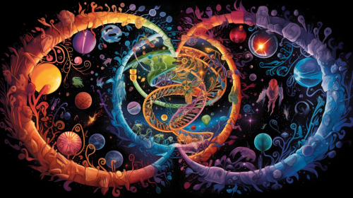 An intricate artwork of a DNA double helix, surrounded by concentric atoms, planets, plants and animals. Show a gradual transition from simple to complex structures, symbolizing the evolutionary process, with a gradual change in colour or intensity. Use a cosmic space background to convey the vastness of the universe. Incorporate subtle motifs like fractals or Fibonacci spirals to hint at the underlying mathematical and natural patterns in the universe. --ar 16:9