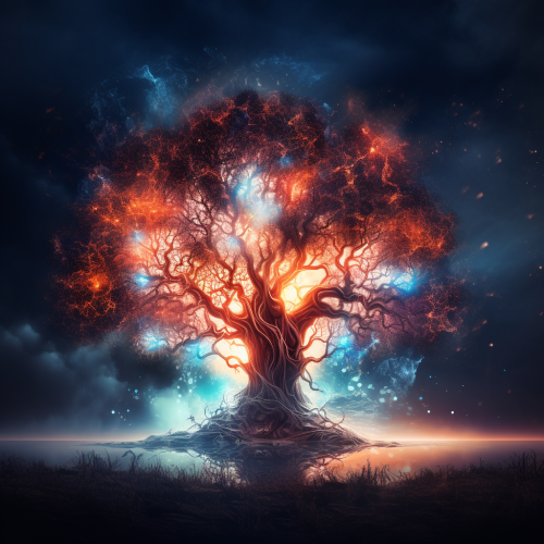 Card of a dying tree of life for a hypnotherapist website, tree without leaf, night, warm atmosphere, displayed in small grid css table aligned, light orange and blue color, white background, no text::2, design, ux/ui, ux, ui, 4k, ultra detailed, web view --no face, grid misalignment