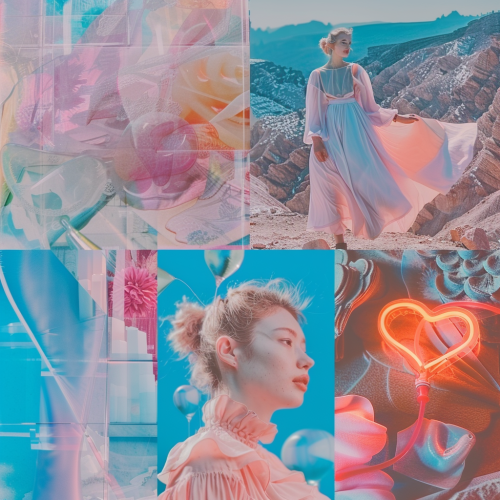 a collage of opposites that is nostalgic futuristic fairy tale, Wes Anderson aesthetic, rare, independent film style, pastel color palette, moody, Aphrodite aesthetic theme, real photo, grainy photography, vintage aesthetic, unique geometric details, nature aesthetic, futuristic nature, fun, playful, royal, fashion, playful, moody, real life, candid photography, photography, real photo, film by Wes Anderson, landscape film photography, role of thirds, weird, crazy scene from movie, chaos, cinematic landscape, heart neon sign, photography, mystical, edgy, magazine cutouts --v 6.0