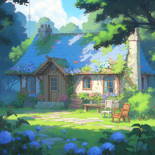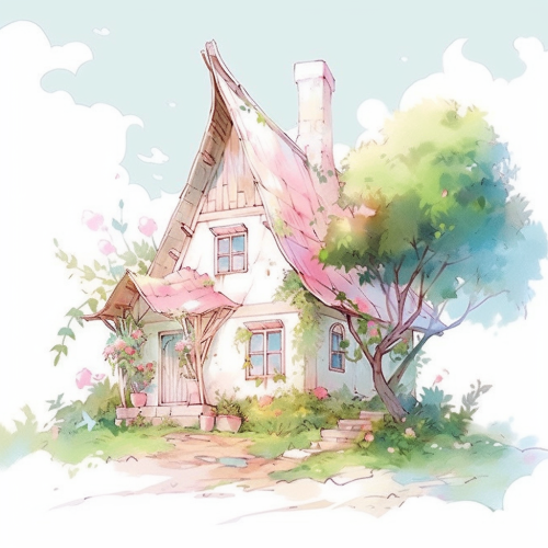 beautiful. watercolor. A small house that looks like something out of a fairy tale. Plain and simple white walls. One room. There aren't many things. --niji 5