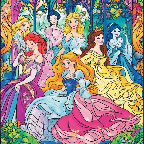 Create a colorful cover for a coloring book featuring 50 fairy tale princesses. The cover should be vibrant and visually appealing, showcasing a variety of iconic fairy tale princesses like Cinderella, Snow White, Rapunzel, Ariel, Belle, and others. Each princess should be recognizable and depicted in a whimsical, fairy-tale style, suitable for a children's coloring book."