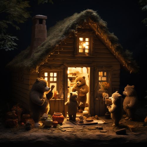 a male goldilocks and three bears at night outside a little cottage in the woods in the style of shadow box fairy tale story --s 50