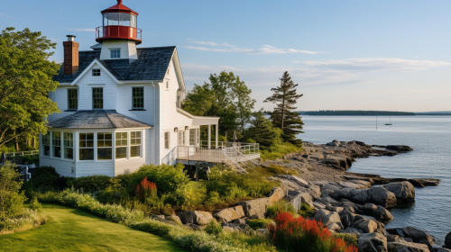 photo of a refurbished lighthouse home on the coast of Portland, Maine, in the style of a fairy tale cottage. Sleek and modern with a rooftop garden. --ar 16:9