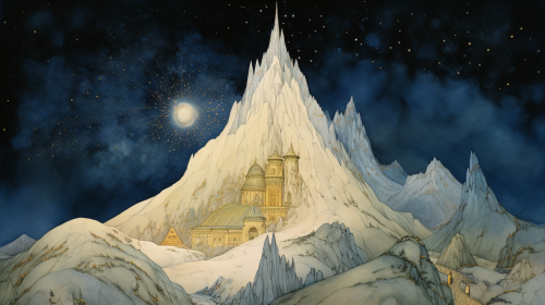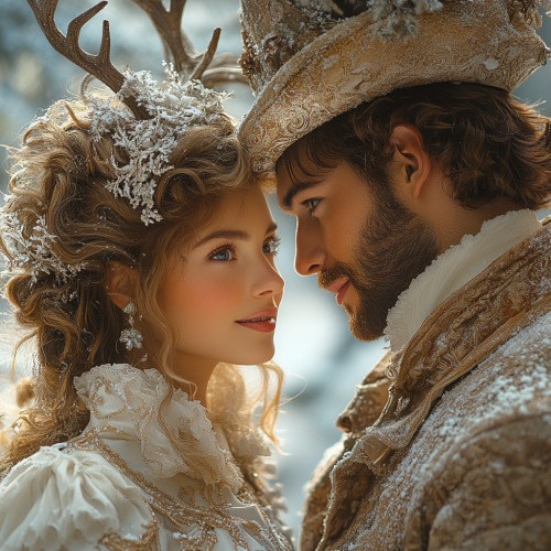 A man and a beautiful girl are depicted in full-length in a winter fairy tale setting through fantasy, realistic photography. The image boasts high detail, a cinematic quality, stunning visuals, hyper-realistic elements, sharp focus, high resolution (8k), and an insanely detailed presentation. --v 5.2 --s 450