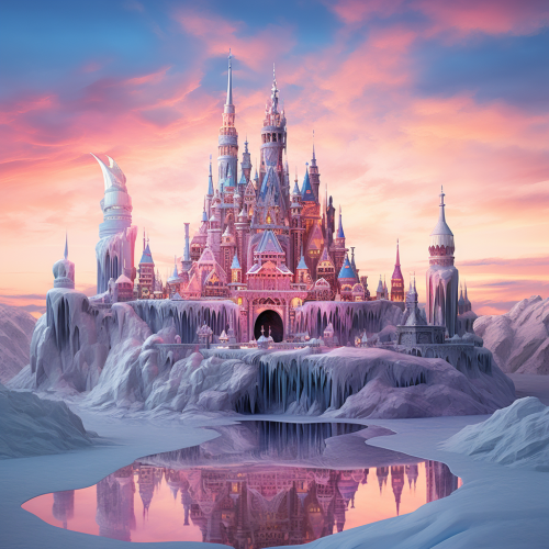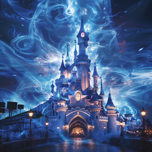magical disneyland paris castle at night, lit in indigo covered in swirling selfie photographs of tourists covering turrets and areas of the castle --v 6.0 --s 250