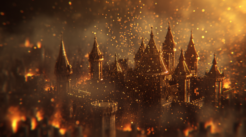 hbo title sequence, 3D macro fly through shot of miniature fantasy kingdom citadel, castle, turrets, walls, detailed made of gold,darkly lit, moody, detailed macro, depth of field, molten gold streams, moodily lit, cinematic detail shot romancing details, burning embers, physical lens effects, lens flare, bokeh --ar 16:9 --v 6.0