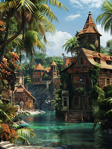 majestic image of a medieval island carribbean kingdom foliage, dark wood buildings, high detail crisp, bright, island water, carribean style buildings, african influence, --ar 3:4