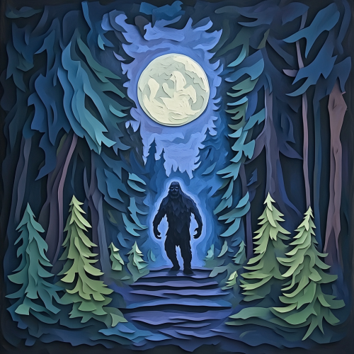 a splendid painting of a magical moonlit forest with deer and other woodland creatures in the style of Juan brufal. Wood cutout style art vibes. Gorgeous nighttime color scheme with black, gray, purple, etc. The kind of art you'd see in a contemporary gallery. High end. Stunning. Visually amazing. 3D vibes. Simplicity of Edward Hopper vibes.