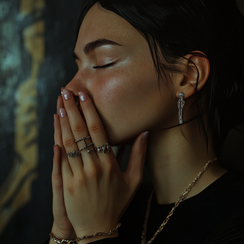 A woman in profile covering her mouth with her hands, hyper realistic, hyper realistic details of the face, religious necklace twisted on her hands, 8k