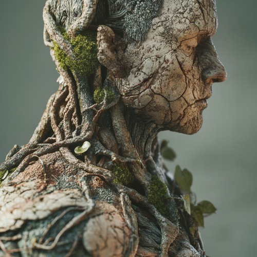 Create a hyper-realistic 3D image in 8K resolution that seamlessly merges human anatomy with organic plant structures and roots. The skin should intertwine with roots, veins resembling plant tendrils, and limbs partially transforming into tree branches and leaves. The fusion should be smooth, highlighting the natural integration between the human body and the plant life. Use detailed textures for the bark, leaves, and skin, with dynamic lighting to emphasize depth and contrast in the organic growth.Create a hyper-realistic 3D image in 8K resolution that seamlessly merges human anatomy with organic plant structures and roots. The skin should intertwine with roots, veins resembling plant tendrils, and limbs partially transforming into tree branches and leaves. The fusion should be smooth, highlighting the natural integration between the human body and the plant life. Use detailed textures for the bark, leaves, and skin, with dynamic lighting to emphasize depth and contrast in the organic growth.