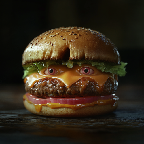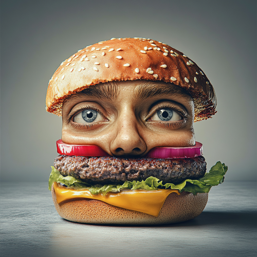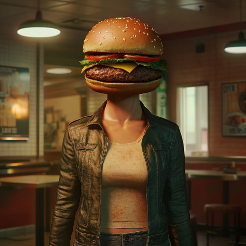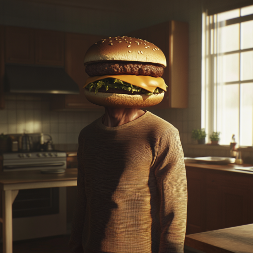 A hyper-realistic image of a human body with a hamburger for a face. The body is fully human, dressed in casual modern clothing, standing in a realistic environment like a city street or a kitchen. The hamburger face should be detailed with layers of lettuce, tomato, cheese, and a juicy patty, but no facial features, just the burger. The lighting is natural and photorealistic, giving the scene a slightly surreal, yet believable look, as if a real person has a hamburger for a head