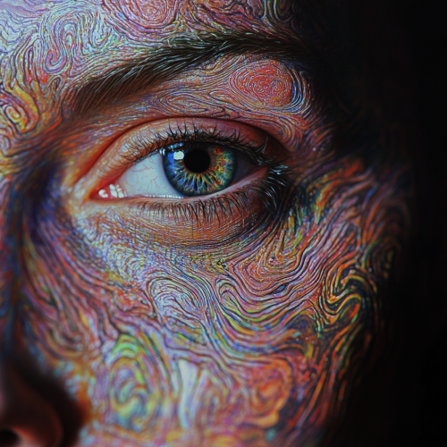 Create a hyper-realistic close-up shot of a human eye, capturing intricate details of the iris, with a striking combination of yellow, green, and blue hues. The eye is framed by the natural textures of the surrounding skin, including fine hairs and subtle skin lines, with soft lighting that enhances the depth of the iris and reflects softly off the surface. The focus is sharp on the iris, highlighting the unique patterns and colors, while the rest of the surrounding skin and features fade slightly out of focus for an artistic yet lifelike portrayal. --ar 3:2 --v 6.1