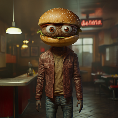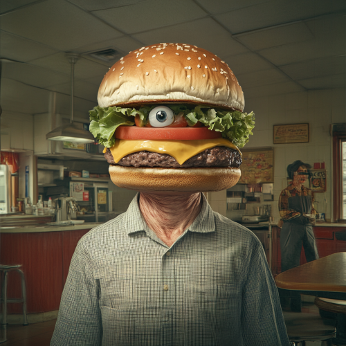 A hyper-realistic image of a human body with a hamburger for a head. The body is fully human, dressed in casual modern clothing, standing in a casual environment like a diner or kitchen. The hamburger head has a realistic human face integrated into the top bun, with expressive eyes, a nose, and a mouth. The natural lighting highlights the textures of both the human body and the hamburger head, creating a surreal yet believable scene where the human face blends seamlessly into the burger's form. It has two eyes and a mouth