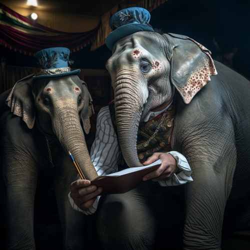 professional photo of elephants with human features with clown makeup on in a circus trying to hold paperwork, 4k, hyper realistic, nature photography