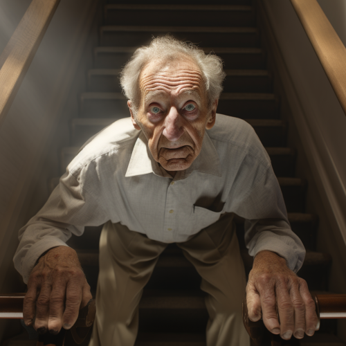 elderly man on stair chair lift going up stairs - hyper realistic human - accurate facial detail - accurate hands - no out of focus peripheral