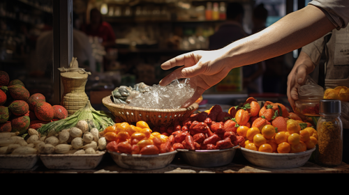 A seller was selling human hands in the market, there are hands on the counter, istanbul, commercial photography, hyper realistic, --ar 16:9